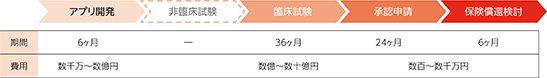 また、治療用アプリの開発では通常の医薬品や医療機器の開発プロセスで求められる非臨床試験が省略できたり、ソフトウェア自体が製品となるため、医療機器承認後の製造過程においても、製造設備が不要である、工程管理や品質管理が比較的容易であるなど、開発コスト、開発期間、販売後の収益性といった多くの面で大きくリスクが低減できます。