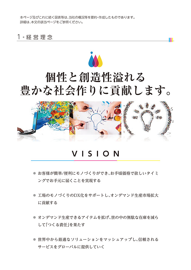 (2)表紙の次に「1 経営理念」~「3 業績等の推移」をカラー印刷したものを記載いたします。