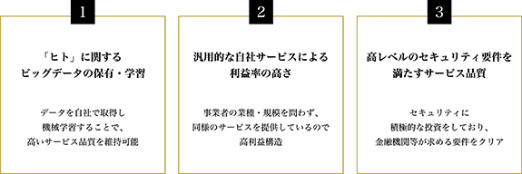 当社グループの大きな特徴として、サービス提供の過程でユーザーから取得した「ヒト」に関するデータを、ユーザーにサービスを直接提供する事業者ではなく、当社グループが保管している点が、競合他社と異なっていると考えております。日々取得するヒトに関するデータを継続的に機械学習することで、サービス品質の維持・向上に繋げており、導入先サービスにおける離脱率(ユーザーが途中で離脱してしまう割合)の低さに高い評価を得ております。また、当社グループは、事業者の業種・規模を問わず汎用的なサービスを提供するため、導入事業者ごとに多額の開発費用が発生せず、高利益構造となっております。さらには、ユーザーの機微なデータを自社で保管している点から、情報漏洩を防ぐためにセキュリティに積極的な投資をしており、金融機関等が求める高いレベルのセキュリティ要件をクリアしております。以上の3点が、当社グループの競争優位性の源泉になっていると考えております。
