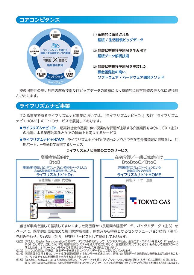 (2)表紙の次に「睡眠解析技術で、未来社会に健康と安心を提供する」~「業績等の推移」をカラー印刷したものを記載いたします。