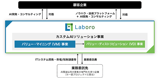 当社の先行取組の実施を通して蓄積されたAIソリューション開発とその導入による企業変革に関するノウハウと技術プラットフォーム(「B)蓄積応用するノウハウ・技術」に詳細)を応用し、効率的・効果的・スピーディな価値創出を目指すAI開発・コンサルティングサービスを提供する形態を、AIの応用価値(バリュー)を広く流通させる(ディストリビューション)意味合いから「バリュー・ディストリビューション事業」として展開しております。