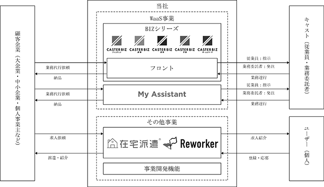 このような従来型のサービスが未だに多く提供されている中、当社においては、人数単位ではなく時間単位でのサービス提供が可能で、当社のリモートアシスタントが依頼に応じて稼働し、分単位から年単位で様々なタスクに対応したサービスを提供しております。「リモートアシスタント」とは、当社従業員で構成するフロント(ディレクター)と、従業員及び業務委託者で構成するキャスト(作業者)を指し、フロントは顧客企業からの仕事依頼を確認し、実際に作業を行うキャストのアサイン及び作業完了後の成果物の確認・納品を行っております。固定の人員に限った対応ではなく当社に参画する「リモートワーカー」のリソースの中から必要かつ有用なスキル・工数分だけ柔軟に利用が可能であること、顧客企業は依頼ごとの個別のマネジメントや契約管理が不要であることが、WaaS事業の主な特徴です。従来型のサービスは、中小企業にとって利用しづらく、顧客企業の負担が重い状況があったものの、リモートワークを駆使したWaaS事業という新たなビジネスモデルの構築により、従来型のサービスの利用が進んでいなかった中小企業を中心に、顧客開拓を進めております。
