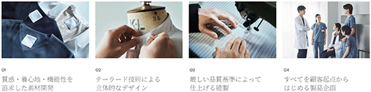 加えて、テーラード技術による立体的なデザイン、当社の厳しい品質基準をクリアしたファクトリーにおける縫製など、デザイン・素材・縫製、その全てにこだわり抜き、医療現場での使用に最適な機能性や耐久性と、他社が真似できないようなファッション性と着心地を兼ね備えた商品を提供し、メディカルアパレルの高付加価値化を図っております。