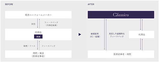例えば当社の定番の白衣であるクラシコテーラーは、顧客からのフィードバックを基に、素材、デザイン及びパターンといった機能性・デザイン性の両方の観点から複数回の改良を実施しました。