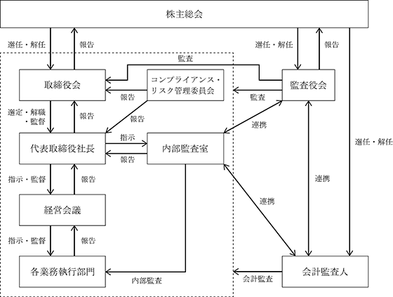 (2)週に1回、社長・業務執行取締役・執行役員が出席する経営会議を開催することで、経営状況の共有を行うとともに各組織の活動状況を把握する。