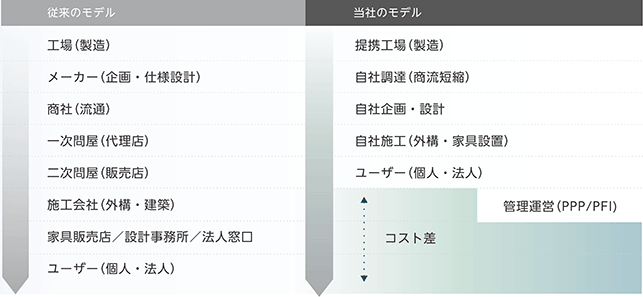 当社は、資材調達から設計・施工、家具演出までを自社で統合管理することで、従来モデルに比べて短納期かつ高い再現性を実現しています。発注や施工の分断によるコスト増・品質低下を回避し、効率性と安定性を兼ね備えた事業モデルを構築しています。