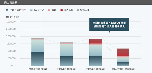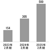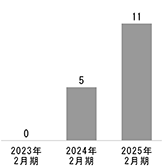 DEPOS事業での2025年2月期法人取引先累積件数は500件、受注売上は113百万円、空間創造事業での法人案件施工件数は11件となりました。今後も、両事業の連携をさらに強化し、法人取引先の継続した拡大を行うことで持続的な収益拡大を目指しております。DEPOS事業における法人取引先累積件数推移、法人顧客受注売上推移、空間創造事業部の法人施設、商業施設等の法人案件施工件数推移は次のとおりであります。