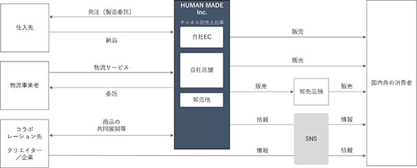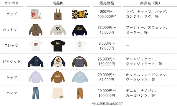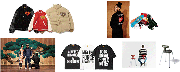「HUMAN MADE」ブランドとして、「KAWS氏(注)1」、「VERDY氏(注)2」等のクリエイター等とのコラボレーションや、「NIKE」、「Levi`s」といった世界的ブランド企業とのコラボレーションにより、各種商品を展開しています。