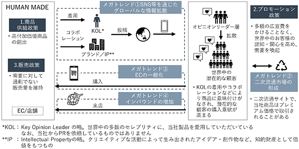 これらの著名人及び企業は、自らの価値向上にもつながるプロモーションにも積極的に取り組んでくれるほか、グローバル企業側においてもブランドの価値向上や認知度向上につながる広告宣伝として積極的に実施する傾向にあります。「HUMAN MADE」のコアファンとなっている国内外のミュージシャンや俳優等のセレブリティは自身のSNS、InstagramやTikTok等さまざまな機会を通じて自発的な情報発信を行ってくれており、当社にとっての宣伝効果は高く「HUMAN MADE」ブランドの価値向上や認知度向上につながっています。