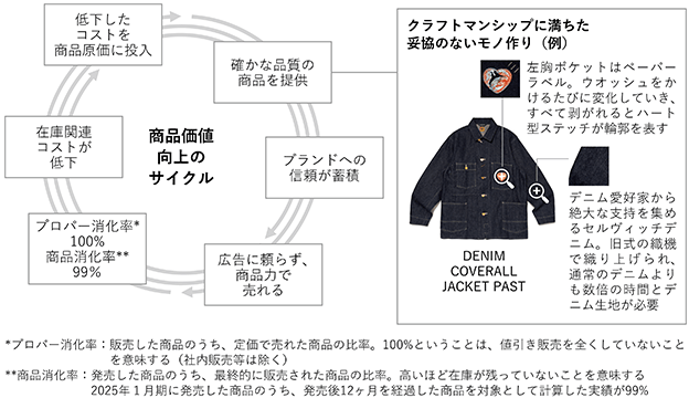 また、商品の企画・デザイン段階から素材等品質や風合い等に拘った商品を作り、お客様の満足度の高い商品を限定的に供給し、販売と同時に完売する(プレミア化)ことが基本的な流れとなっています。