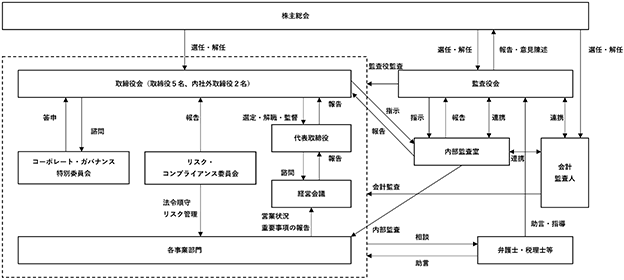 ロ.「会議体規程」及び「経営会議規程」により、業務執行取締役が出席し、常勤監査役が陪席する経営会議を原則として隔週で開催し、重要な業務執行の一部の決定及び利益計画の進捗状況の管理に関して、取締役会から委任を受け、機動的な意思決定を図る。