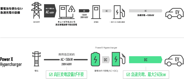 当社グループが独自開発している「PowerX Hypercharger」は、最大出力240kWhによる短時間充電を可能とし、商業施設等の短時間の滞在を見込む場所での充電をサポートすることができます。また、変電機・パワーコンディショナー(注)・充電器を兼ね備えたオールインワンの充電設備であり、高圧変電設備及び工事が不要です。一般商業用の低圧電力(200V)契約で利用できることから設置場所の制限が少なく、低コストでの設置が可能です。