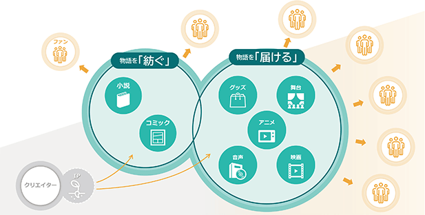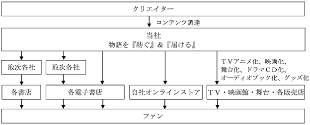 当社は、小説・コミックスの編集・制作を通じて物語を「紡ぐ」機能と、アニメ・舞台・映画・音声コンテンツ、グッズ、各種イベント等を通じて物語を「届ける」機能をあわせ持ち、クリエイターとファンを一体的につなぐIP創出・展開事業を営んでおります。物語の企画・編集から、書籍化、コミカライズへとつなぎ、さらにアニメ化、舞台化、映画化、ドラマCD化、オーディオブック化、グッズ展開やイベント展開へと広げることで、同一の世界観やキャラクターを多様な形でファンに届けることができる点に特徴があります。