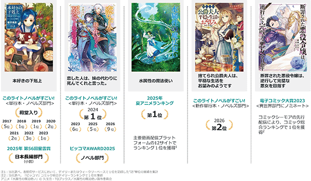 (注) 1「このライトノベルがすごい!」は株式会社宝島社が発行するライトノベルのガイドブックであり、関係者及び一般のオーディエンスが実施するアンケートによる評点で、各部門のランキングが決定します。