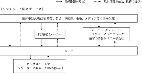 ソフトウェア開発サービスにおける受注形態は、システム・インテグレータ等(防災機器メーカー、コンピュータ・メーカー、システム・インテグレータ、顧客の情報システム子会社を含む。)からの受注及び顧客からの直接(防災機器メーカー、コンピュータ・メーカー、システム・インテグレータ顧客の情報システム子会社との取引を除く。)受注で構成されております。システム・インテグレータ等からの受注は、既存の主要取引先を中心に安定的な案件獲得に寄与しており、継続的な稼働率の確保につながっております。一方、顧客からの直接受注は、提案内容や価格設定の自由度が高く、付加価値の創出を通じた収益性向上に資する受注形態として位置付けております。当社では、両受注形態の特性を踏まえ、案件規模、収益性及び継続性のバランスを考慮した受注ポートフォリオの構築を進めております。
