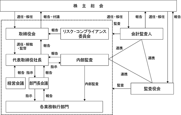 具体的な企業統治の体制として、毎月の定例及び臨時の取締役会に加え、取締役及び常勤監査役で構成される経営会議、取締役(社外取締役を除く)及び常勤監査役並びに各部門長で構成される部門長会議を開催し、情報の共有と効率的な業務執行、相互の監視と牽制を行っております。