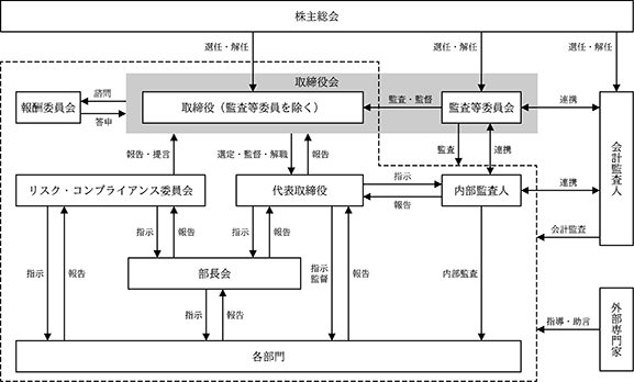 当社は、取締役の執務執行の監査等を行う監査等委員を取締役の構成員とすることにより、取締役の監督機能を通じて一層のコーポレート・ガバナンス体制の強化を図るために、2023年6月30日開催の臨時株主総会の承認をもって、「監査役設置会社」から「監査等委員会設置会社」に移行しております。当社のコーポレート・ガバナンスに係る組織体制の概要は以下のとおりであります。